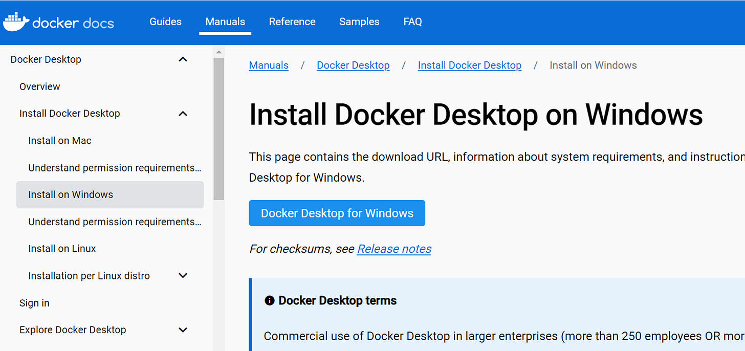 Download and install from the official site: https://docs.docker.com/desktop/install/windows-installRun the installer (