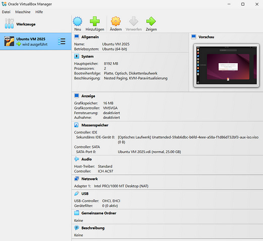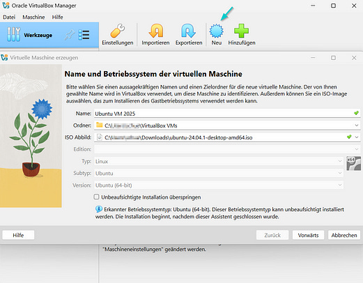 Next, we create a new virtual machine in the VirtualBox Manager and give it the name Ubuntu VM 2025. Here we select Linux as the type and Ubuntu (64-bit) as the version. We also select the previously downloaded ISO file from Ubuntu as the ISO image. It would also be possible to add the ISO file later in the mass storage menu.