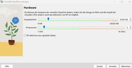 We then assign the appropriate resources to the virtual machine. I choose 8 GB (8192 MB) RAM, as my host system has 64 GB RAM. I recommend 4GB (4096) as a minimum. I assign 2 processors, as my host system has 8 cores and 16 logical processors. It would also be possible to assign 4 cores, but this way I have enough resources for my host system. You can find out how many cores your host system has by opening the Task Manager in Windows and looking at the number of cores under the Performance tab under CPU.